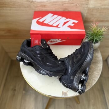 The all-black monochromatic colourway creates sophisticated versatility across multiple styling contexts and seasonal palettes. The signature column-spring cushioning system sits visibly along the lateral and medial sides, creating distinctive design architecture that defines this silhouette. Premium leather and synthetic upper construction demonstrate quality commitment beyond standard releases. Collaborative branding elements add subtle prestige touches while maintaining the sneaker’s core athletic authenticity and performance credibility.