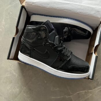 These Retro 1 Patent Space Jam Sneakers offer a bold black-and-blue design inspired by classic streetwear. Crafted for boys, they feature a glossy patent finish, cushioned soles, and durable construction for all-day comfort.